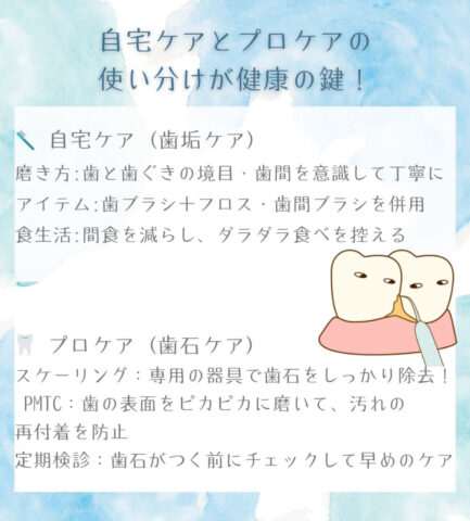 健康な歯を守るには、この「自宅ケア(歯垢ケア)」と「プロケア(歯石ケア)」の使い分けがとっても大切です!